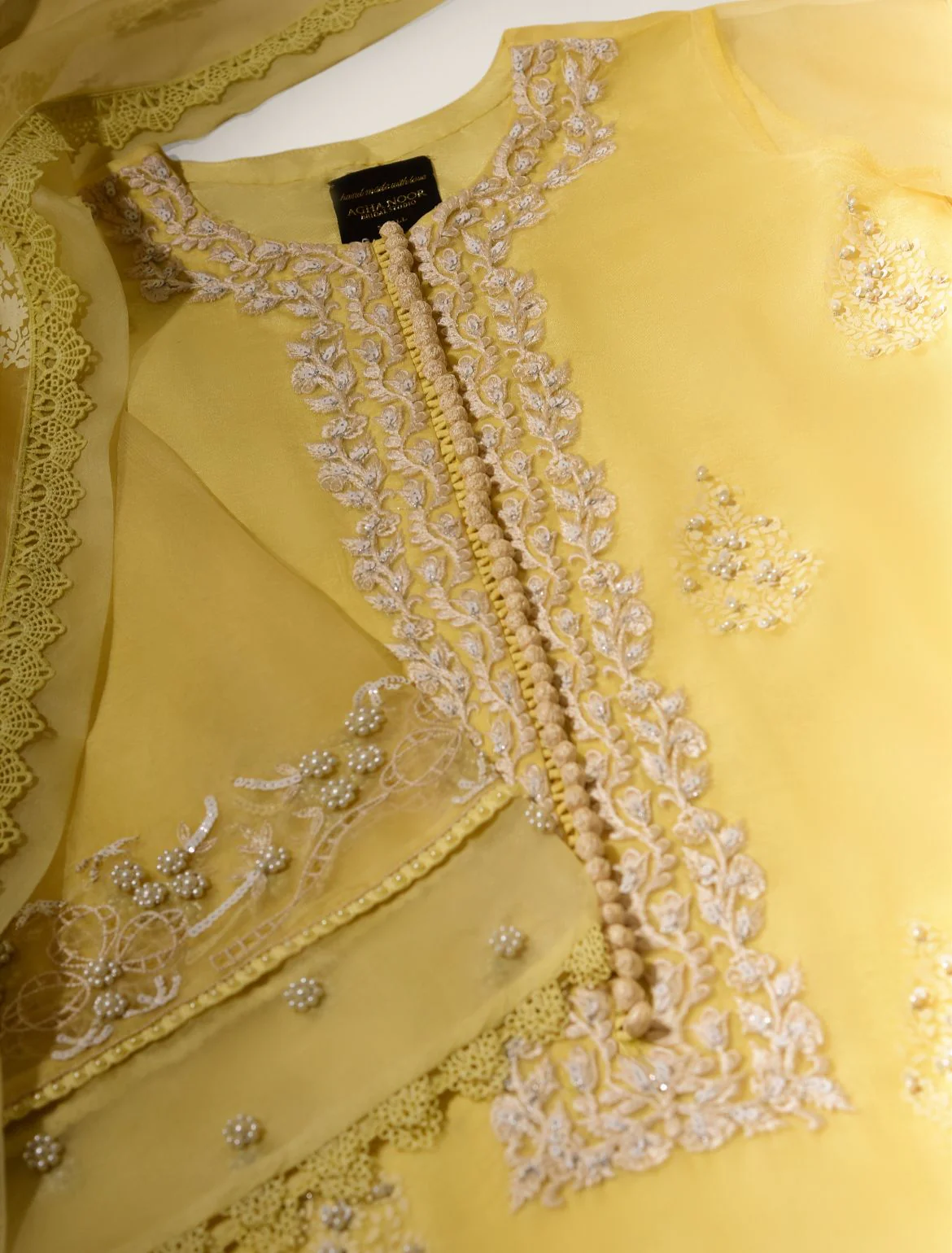 Adorned on pure cotton net, in a pastel yellow hue with intricate single thread ivory embroidery alongside clusters of pearls on kameez and trousers. The length of the long kameez is 43 inches. The pure organza dupatta features offwhite hand block print motifs with pretty lace edging.