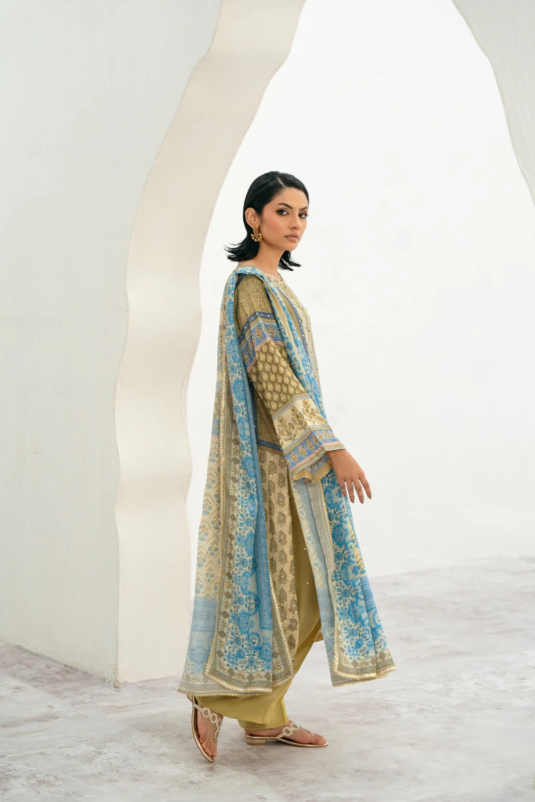 Discover Agha Noor's festive prints created with utmost detailing alongside immaculate tailoring. canvas of stunning raw silk, is printed with uplifting florals. Enhanced with a gold zardosi handwork neckline with dabka, nagshi, sequins and crystals. Styled with a printed charmeuse dupatta and shalwar as seen.