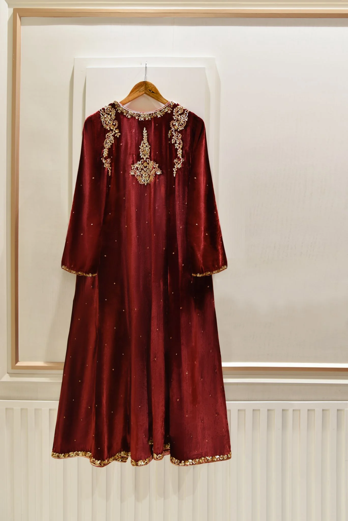 A heavily embellished beautiful three piece on pure dark maroon velvet, adorned with the most stunning hand/ada work of dabka, naqshi, sequins and crystals done by our skilled artisans. Paired with a heavily embellished pure velvet shawl and flappers featuring matching border. The length of the long angrakha is 48 inches.