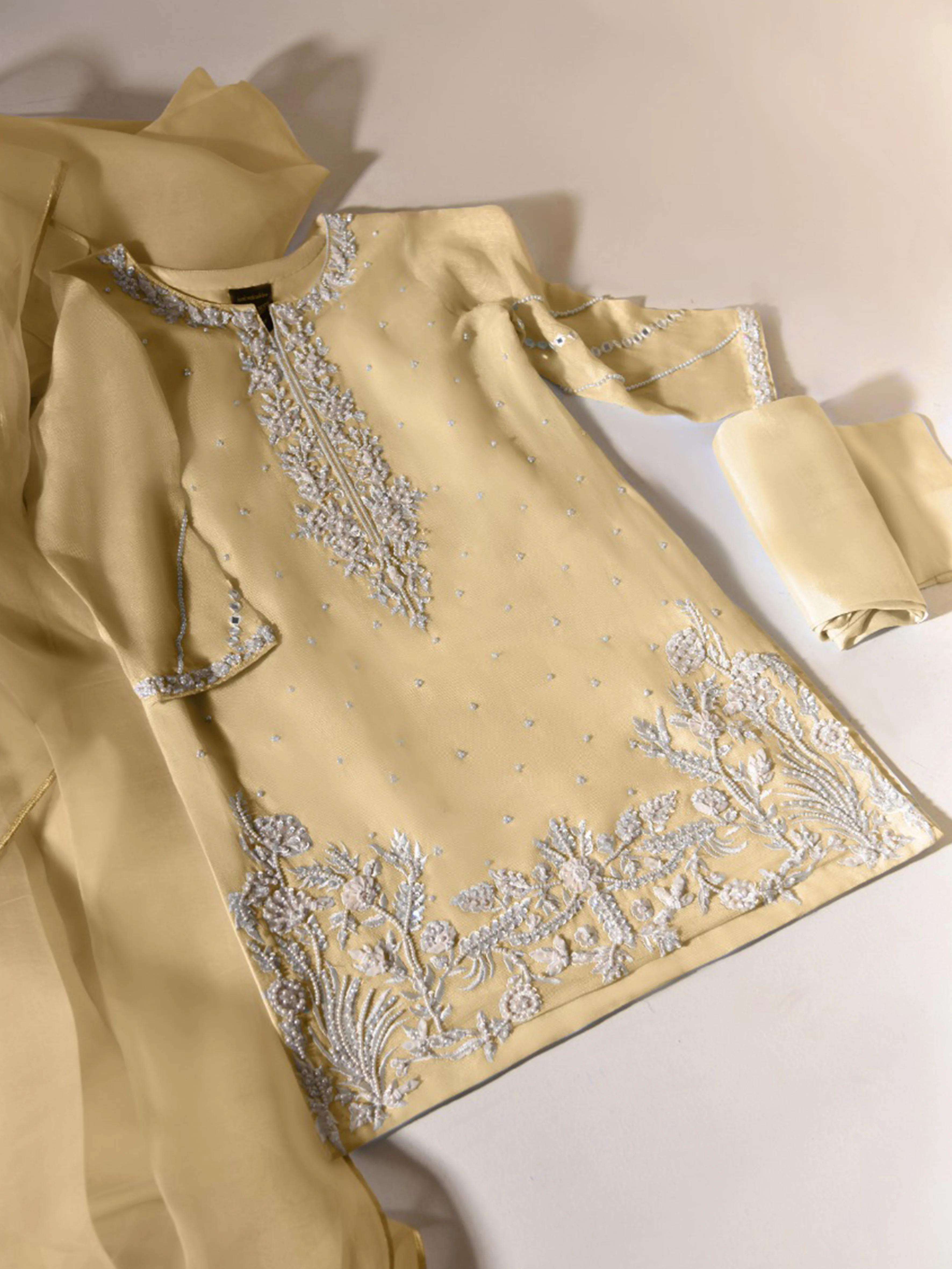Dreamy shade of pastel blue makes up for this beautiful three piece, pure cotton net with intricate ivory embroidery alongside hand sewn pearls, crystals and 3D petals. Paired with a matching pure organza dupatta and raw silk trousers.Ā The length of the kameez is 40 inches.