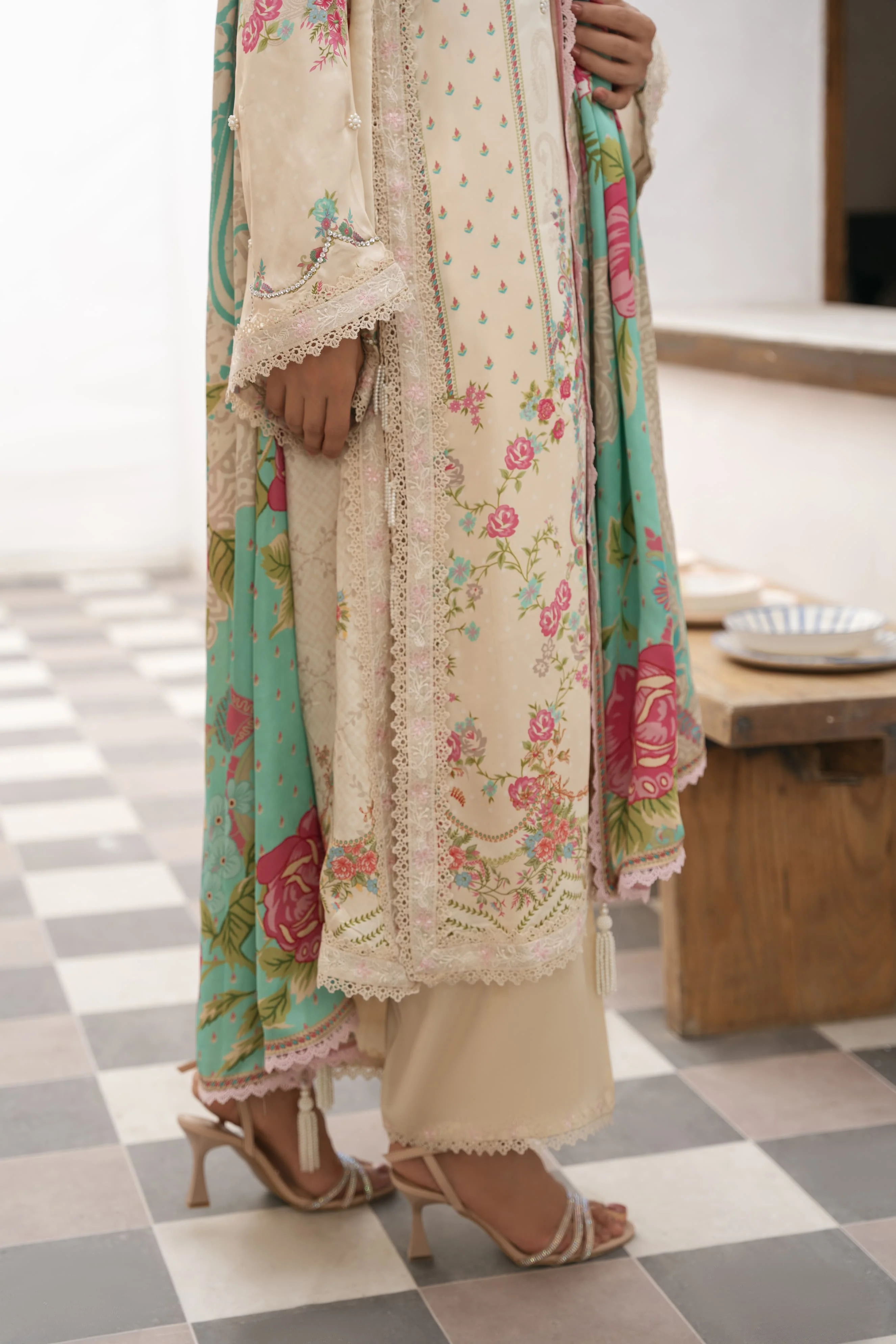 Experience the art of effortless elegance with the ethereal " Lina " ensemble. Offering a modern yet timeless silhouette on printed silk, adorned with an embroidered details featuring clusters of pearls. Paired with an elegant matching pure raw silk Izaar, alongside a matching silk dupatta. This ensemble exudes grace and sophistication, making it a beloved and essential addition to any wardrobe. The length of the long kameez is 45 inches.