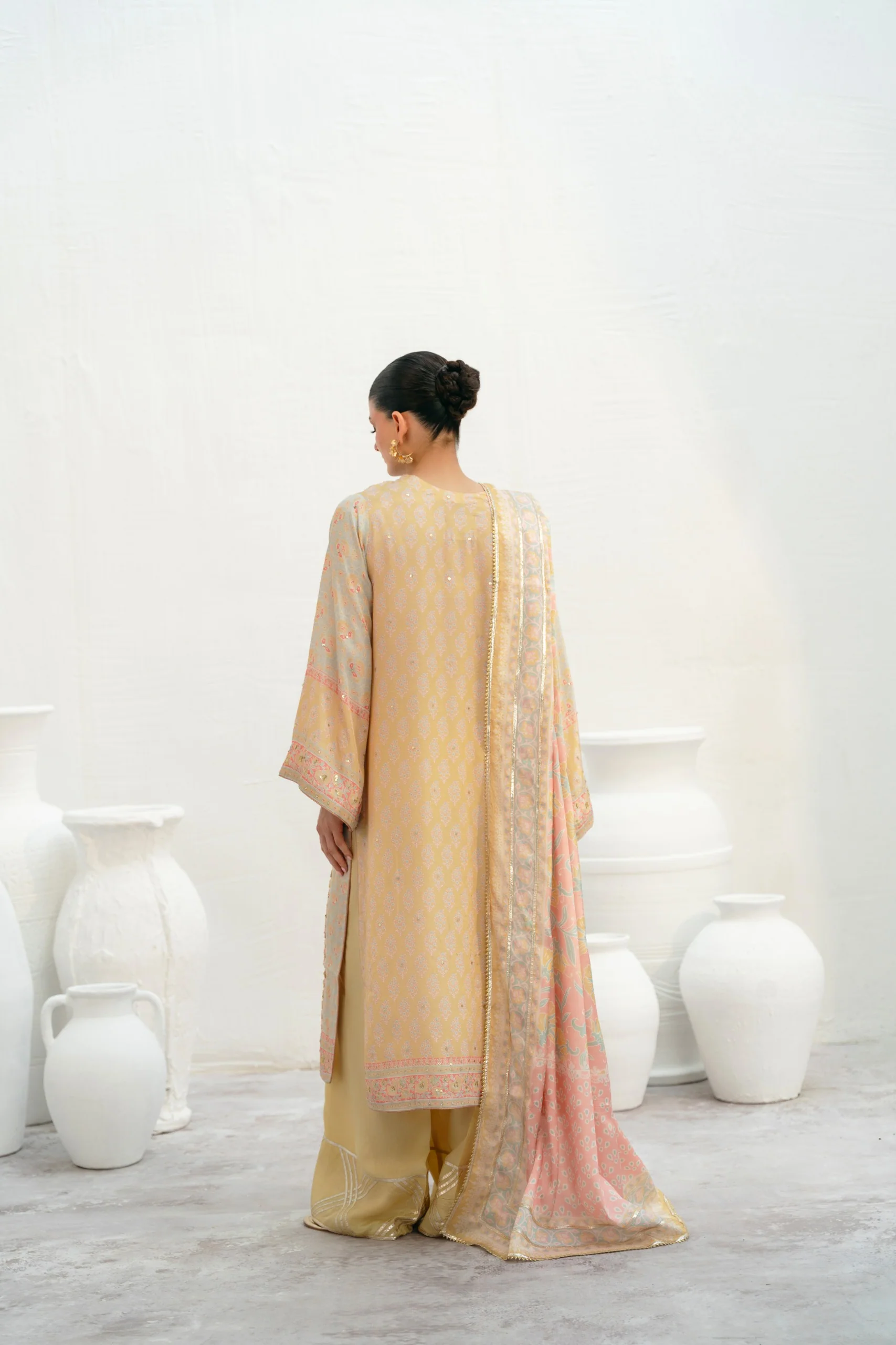 Discover Agha Noor's festive prints created with utmost detailing alongside immaculate tailoring. A canvas of stunning butter lemon cut from raw silk, is printed with uplifting florals and eye-catching shades of beige and pinks. Enhanced with alluring zardosi handwork for a show stopping look. Styled with a printed charmeuse dupatta and trousers as seen.