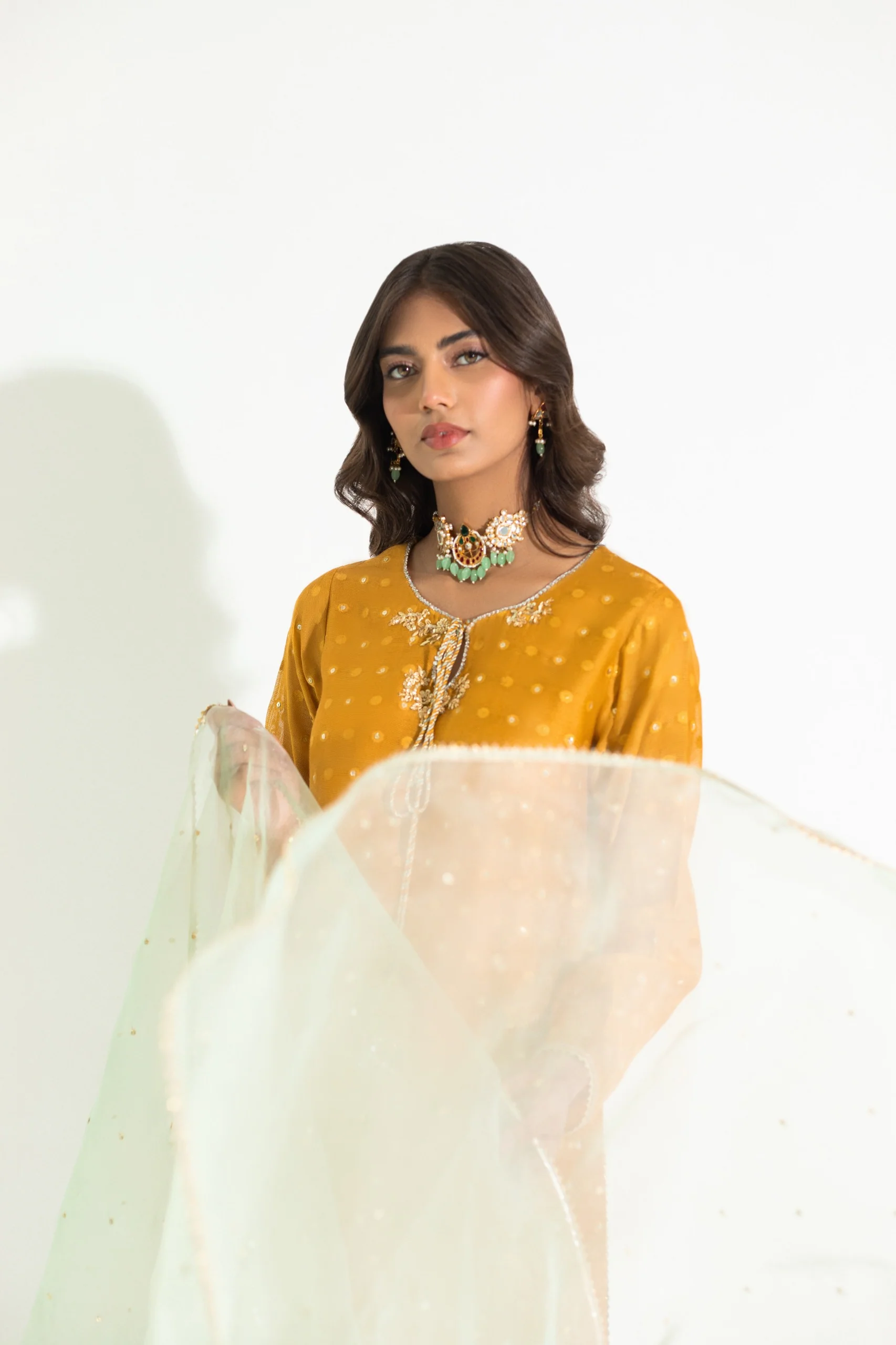 Canvassed on a deep mustard yellow embossed net with handwork/ada details in dabka, naqshi, sequins and nug stones. A beautiful addition ( three piece as seen ) to your wedding wardrobe. The length of the kameez is 32 inches.
