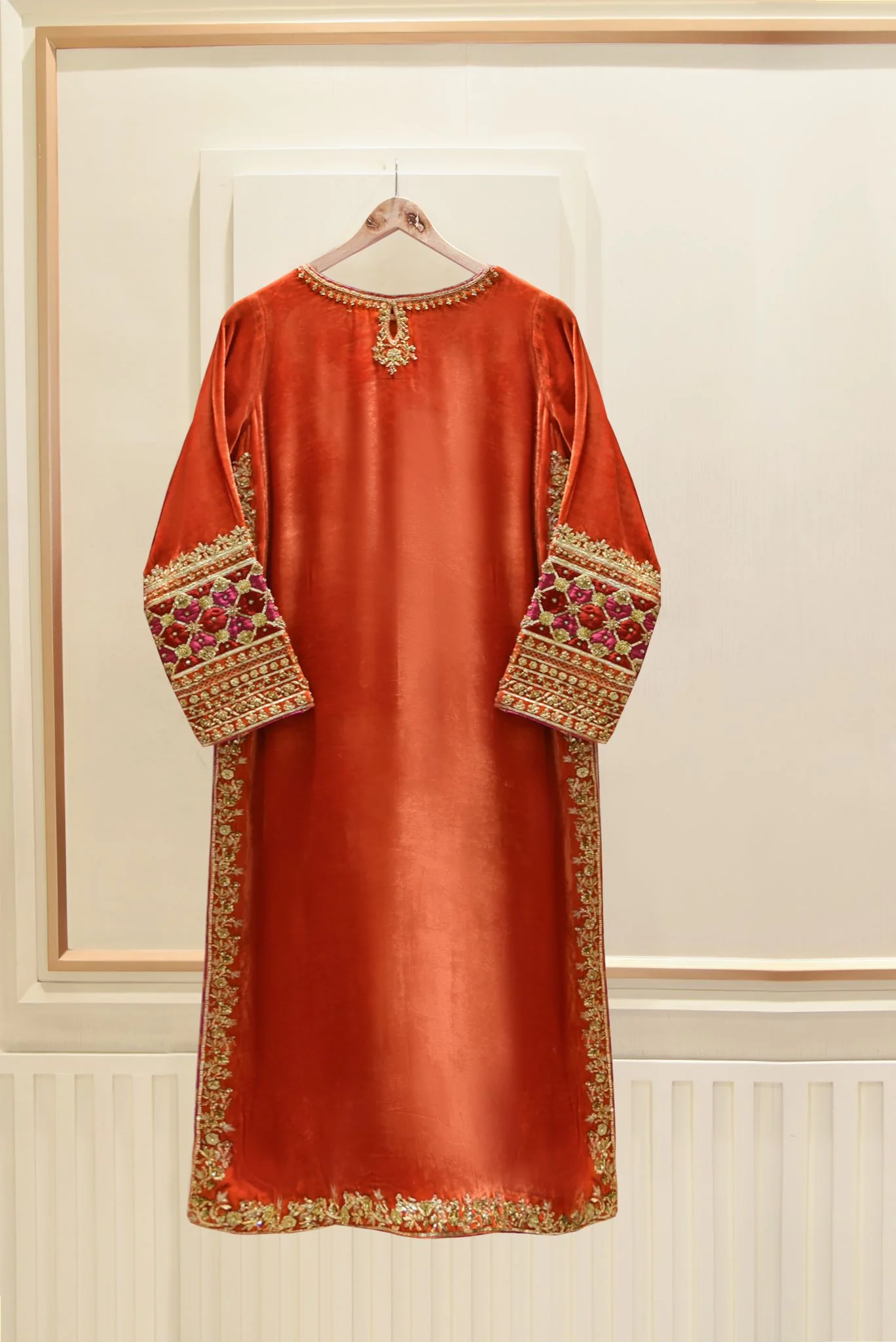 Meticulously crafted from a remarkably glamourous shade of burnt orange ( pure velvet 58 Gms ) “ Rust Velvet “ with its intricate hand crafted details strikes the perfect balance between elegant and eye-catching, making this beautiful design a must have. The length of the long kameez is 48 inches.