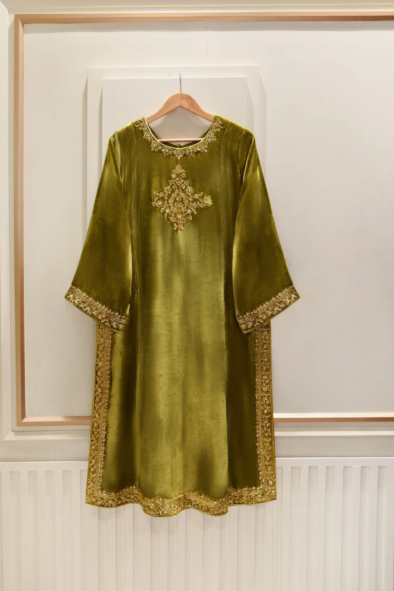A heavily embellished beautiful three piece on a pure dhani green velvet, adorned with the most stunning hand/ada work of dabka, naqshi, sequins and crystals done by our skilled artisans. Paired with a matching pure velvet dupatta and shalwar featuring embellished border. The length of the long Kameez is 48 inches.