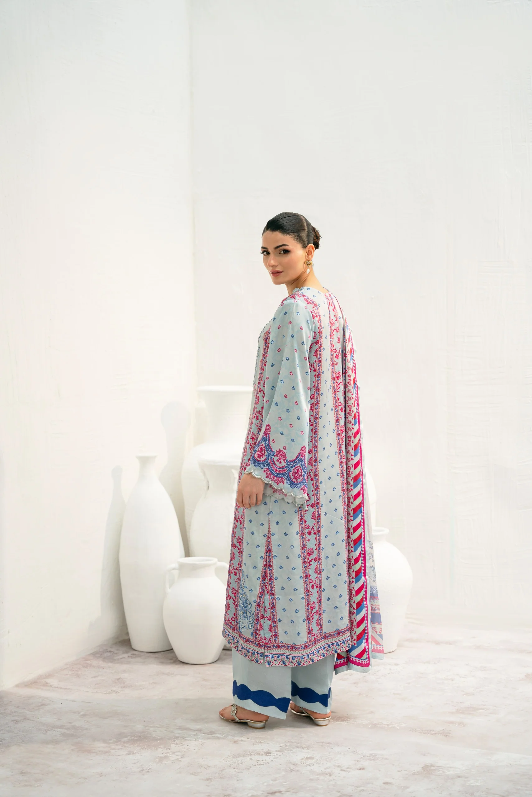 Discover Agha Noor's festive prints created with utmost detailing alongside immaculate tailoring. A canvas of stunning ice blue from raw silk, is printed with uplifting florals and eye-catching shades of ivory and navy blue. Enhanced with a silver zardosi handwork with dabka, naqshi, sequins and crystals. Styled with a printed charmeuse dupatta and trousers as seen.