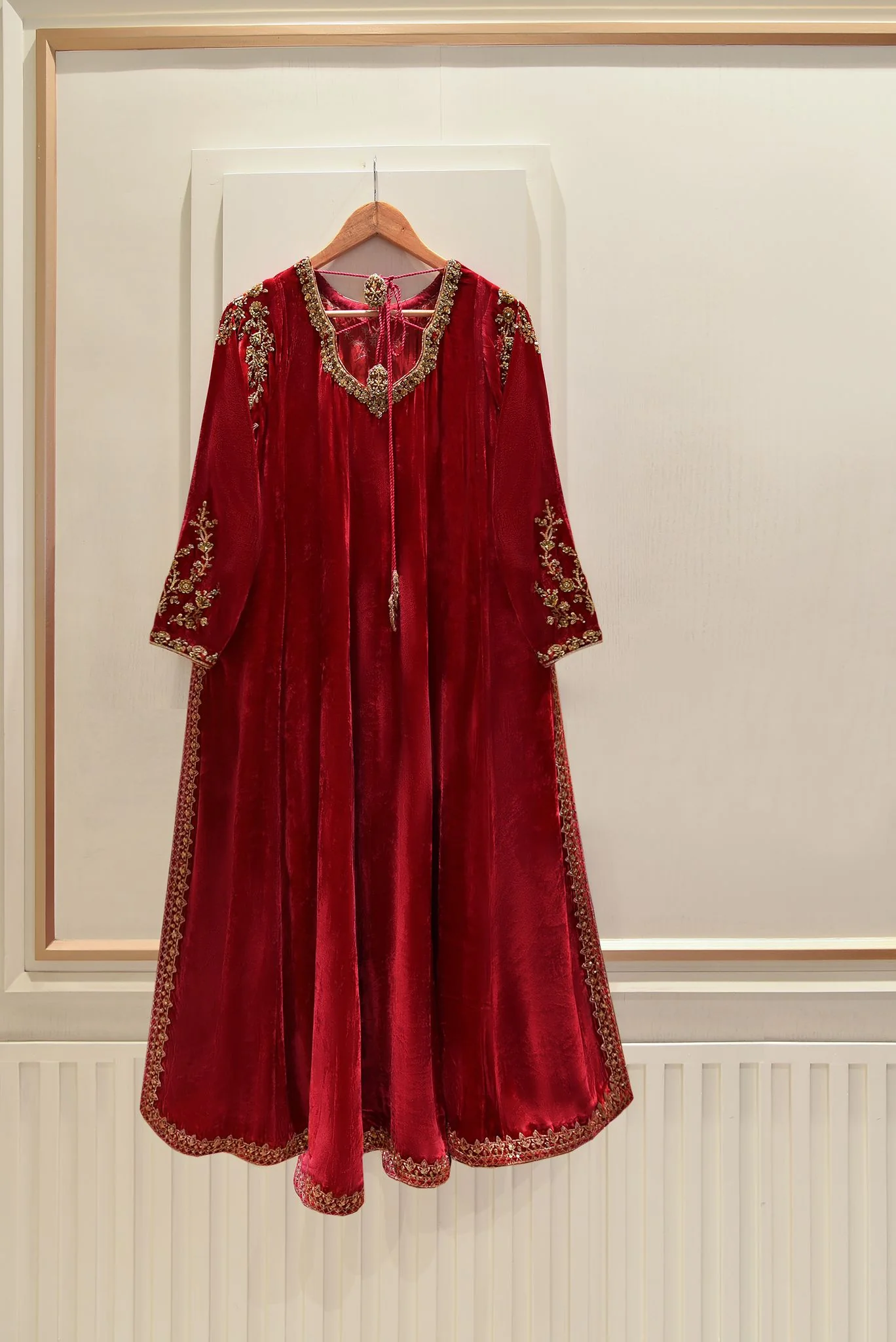 A heavily embellished beautiful three piece on a pure maroon velvet, adorned with the most stunning hand/ada work of dabka, naqshi, sequins and crystals done by our skilled artisans. Paired with a crushed silk dupatta and flappers featuring embellished border. The length of the long kalidaar is 48 inches.